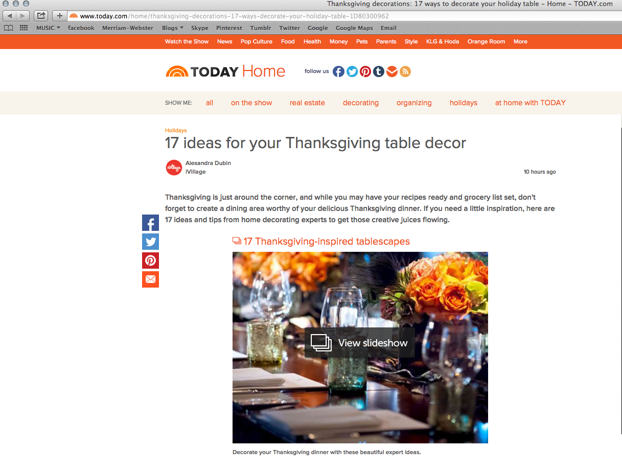 We were happy to participate with Today.com’s feature on Today Home about Thanksgiving Tablescapes. Our creation is shown on the title page!